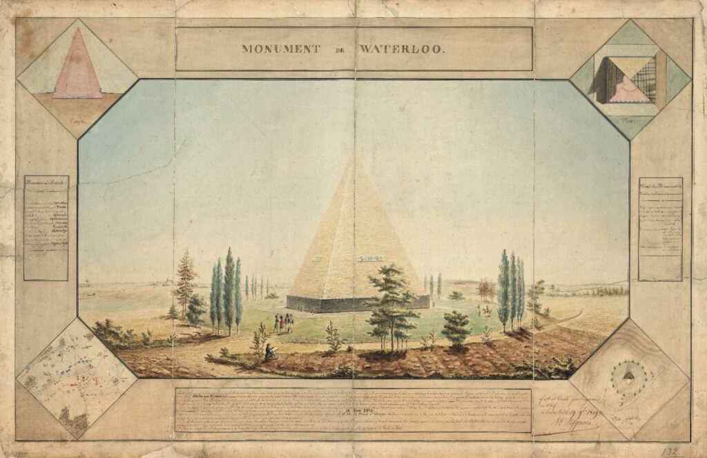 Le roi Guillaume Ier décide, le 11 décembre 1815, de la construction d’un monument sur le champ de bataille et plusieurs architectes prendront part au concours. A l’époque, l’art fait partie du débat public et les critiques publient régulièrement dans les différentes gazettes. On prend partie pour ou contre un artiste, une œuvre, un mouvement comme on le ferait aujourd’hui avec un projet de loi ou un joueur de football[4]. Un architecte qui propose un monument va donc essayer de gagner l’opinion publique à son projet en diffusant des gravures qui illustrent son idée. Le musée Wellington tient dans ses collections deux documents intéressants qui éclairent sur la variété des projets proposés par les architectes.