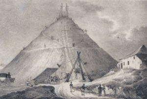 Vander Straeten sort du bois et selon Lederer « le 1er décembre 1819, Vander Straeten remit le dessin d’un tumulus conique, surmonté d’un lion. Le ministre rédigea un rapport objectif sur les deux projets, faisant remarquer que le cône, tout autant que la pyramide, convenait davantage pour un monument funéraire. Le 19 janvier 1820, sous l’influence de la reine Frédérique-Louise, le roi retint le projet de Vander Straeten »[15]