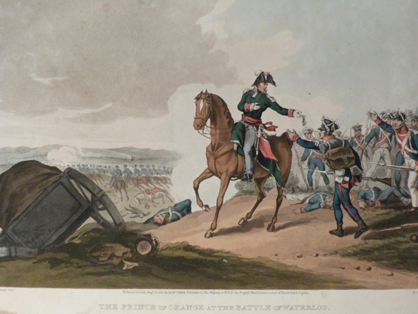 Le 18 juin 1815, le sort du monde se joue dans la plaine de Waterloo, l’Empereur Napoléon Ier est définitivement vaincu par le Duc de Wellington et le Feld-maréchal – Prince Blücher. Les troupes sous le commandement de Wellington son composées de nombreuses nationalités Nassauviens, Anglais, Hanovriens, Brunswickois, Ecossais et Hollando-belges. Ces derniers fournissent les effectifs de 30% de l’armée du Duc et sont commandés nominalement par le jeune Prince Guillaume des Pays-Bas (1792-1849), mieux connu sous le nom de Prince d’Orange[2].