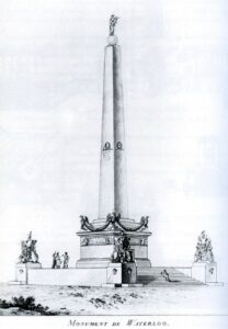 Jean-Baptiste Pisson (1763-1818), architecte de la ville de Gand, imagine un obélisque commémoratif qu’il nomme « Monument projeté pour consacrer la mémoire de la bataille de Waterloo ». Ce monument devait se composer d’un obélisque surmontant huit fontaines symbolisant les « principales rivières de la patrie des vainqueurs » tandis que la base de l’obélisque aurait présenté des textes surmontés d’aigles, possible référence à la France impériale. La guirlande qui relie les aigles était très utilisée dans le style Louis XVI et revient à la mode sous le style Restauration.