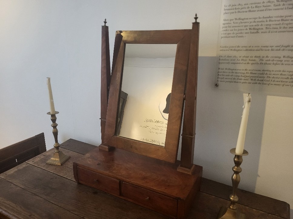 Miroir en psyché de style Empire portant sur deux obélisques dans le goût égyptomanique, circa 1800-1830, Waterloo, musée Wellington.
